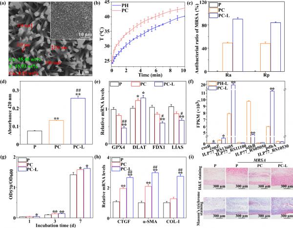 图4.(a)“纳米棒”的SEM形貌;(b)试样的光热响应;试样表面培养1天后耐甲氧西林金黄色葡萄球菌的(c)抗菌率,(d)胞膜通透性,(e)与铜死亡相关的差异基因表达,(f)与铜转运、铜死亡相关的差异基因表达;(g)Alamar Blue法检测试样表面培养1、3、7天的成纤维细胞活力;(h)试样表面培养7天后成纤维细胞CTGF、α-SMA和Col-1的表达;(i)试样植入大鼠皮下7天后H&E和Masson’s trichrome staining图像。*: p < 0.05和**: p < 0.01与P相比;#: p < 0.05和##: p < 0.01与PC相比。