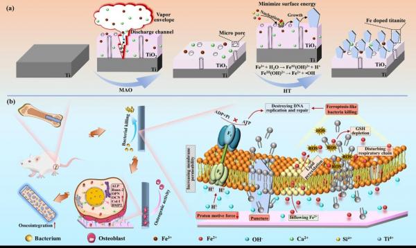 图1.钛种植体表面铁掺杂硅酸钛钙“纳米剑”的制备流程图及其抗菌与骨整合