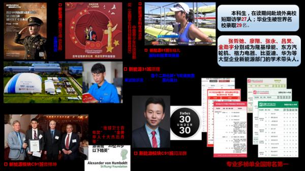 其中,吴浩齐(本硕贯通培养)带领团队首创气磁结合的颠覆性雾化技术,荣获第十三届中国青少年科技创新奖(全国学生科技创新最高奖,屡获课外学术竞赛国家级奖项;巴尔成·巴瓦阿在部队志愿戍边服役荣获三等功;张寇儿屡获国际级和国家级赛艇比赛奖励;曹祥坤两度入围联合国环境署“地球卫士青年奖”,入选联合国儿童基金会青年创变者,当选联合国可持续发展解决方案网络Local Pathways Fellow,获评“全美华人十大杰出青年”,获“创造未来设计大赛”全球唯一特等奖;张哲弛现任隆基绿能全球企业发展与战略总监,主要负责隆基在全球范围内的新技术、新业务、新商业模式等方面的战略合作及投资并购项目;任宇勋赴香港科技大学攻读博士学位期间解决新型质子交换膜材料“卡脖子”问题,并于2022年获得国家级项目资助;廖翔在东方汽轮机有限公司负责研制国内首台超临界二氧化碳示范装备,提出了多项技术创新,十项唯一、首台、最高、首创,五项自主研制。毕业生张永、吕昊、金劲宇等人分别成为格力电器、比亚迪、华为等大型企业新能源部门的学术带头人。