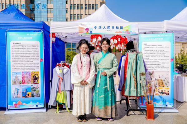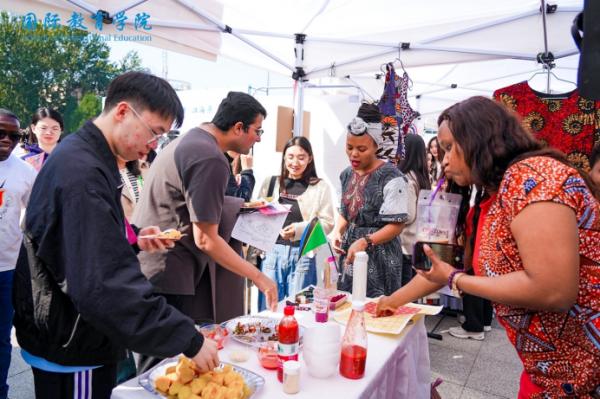 舞台下,来自63个国家的65个文化展位前,身着各式服装的留学生朋友们热情分享了本国的风土人情与历史文化:中亚地区的朋友足蹬油光铮亮的马靴,将我们引入这片神奇而广袤的土地;拉丁美洲的艺术品鲜艳绚丽,灵动流畅的线条散发神奇的气息;坦桑尼亚食物辛辣鲜香,透过饮食文化,带我们“从一粒沙看世界”;各位“游客”穿行于展位前,获取通关贴纸,仿佛也打卡了全世界的文化坐标。