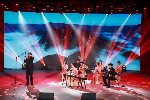 由渭南师范学院大学生老腔社团带来的华阴老腔《将令一声震山川》将民间曲调刚直高亢、磅礴雄浑的唱腔和现代摇滚乐的热情激昂巧妙融合,将全场的氛围推到了高点。第六届“终南杯”诗词大会冠军团队队员杜泽洲在舞台上和同学们进行的“飞花令”你来我往,赢得阵阵掌声,民乐演奏《秦川情》与《飞天乐舞》描绘了千年华夏不朽的壮丽画卷,诗篇《月光下的中国》给我们展现了当代中国的岁月静好……