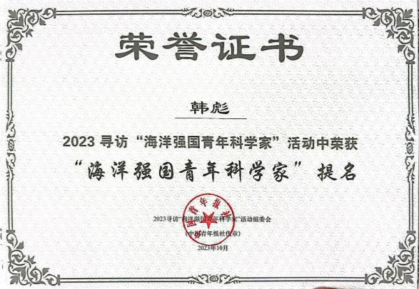 近日,由中国青年报社等单位共同开展的2023年度“海洋强国青年科学家”寻访活动落下帷幕,活动评选出“海洋强国青年科学家”10名、“海洋强国青年科学家”提名20名。西安电子科技大学光电工程学院韩彪副教授荣获“海洋强国青年科学家”提名奖。