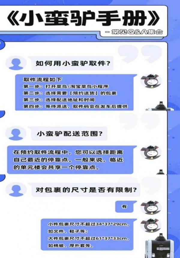 通过菜鸟APP下单预约送货后,“小蛮驴”会将预计到达时间、取件码、停靠位置以短信形式发送给收货人,到达目的地时会电话提醒取件,到达停靠点后会在原地等待3-5分钟,遇到无人取件的情况会将货物送回菜鸟驿站。按小包裹2元,大包裹4元的标准收取费用,并不定期向师生发放优惠券。车厢内是共享格口,四周摄像头开启录像功能,快递被错拿可以到快递中心查询。