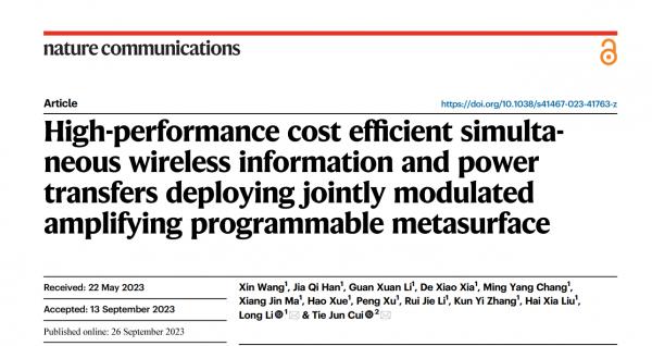 近日,西安电子科技大学李龙教授课题组在电磁超表面携能通信方面取得突破进展,研究成果以《High-performance cost efficient simultaneous wireless information and power transfers deploying jointly modulated amplifying programmable metasurface》为题发表于《自然?通讯》(Nature Communications)上。西安电子科技大学王鑫博士生为第一作者,李龙教授和东南大学崔铁军院士为通讯作者,西安电子科技大学为第一单位。