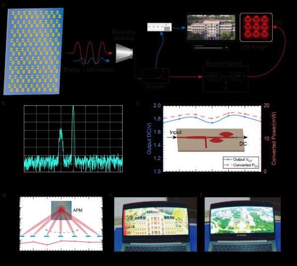 研究人员通过利用频率正交性和有源功率放大可编程超表面灵活的空间场操控能力,设计了有四种独立相位调控状态的功率放大型可编程超表面发射机,探讨了可编程超表面的场增强、最大输出功率、能信波束覆盖角、低峰均比等特性与作用机制,实现了具有低峰均比能信信号的高效率传输携能通信系统。研究人员在微波暗室和室内场景中进行了一系列实验,包括空间入射场增强、视频与无线能量同时传输及大角度能信信道同时调控。这些实验验证了该技术方案在携能通信方面的领先水平。