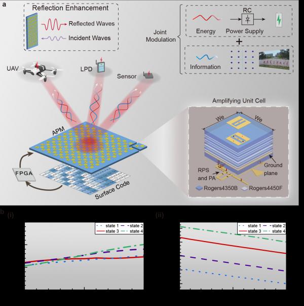 功率放大可编程超表面携能通信系统示意图与单元散射特性(Nat. Commun.14, 6002, 2023)