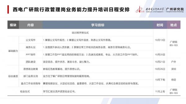 10月13日上午,西安电子科技大学广州研究院行政管理岗业务能力提升培训班开班仪式在海丝知识中心B5-103会议室举行。院党委书记兼行政负责人刘丰雷参加开班仪式,全院行政管理岗及工勤岗等共40余人参会,活动由副院长马博主持。