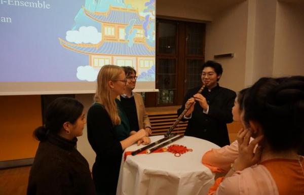 演出获得了观众们热烈的掌声和赞美,观众们纷纷上台与演员们合影留念,表达对中华文化的喜爱和赞赏。来自陕西的“老朋友”谭义明和杜菲娜热泪盈眶地表达对演出的赞美、对家乡的思念,来自帕德博恩大学的达维娜和保罗教授也与现场演奏的同学一起,尝试演奏了竹笛等中国民族乐器,了解中国传统文化。