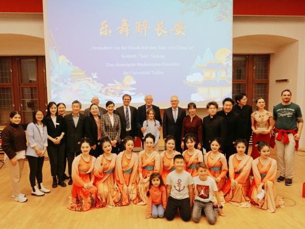 整场演出经精心编排,以中国传统音乐、舞蹈和歌曲为主要表演形式,力求将中国文化的博大精深呈现给德国观众。演出以民乐合奏《花好月圆》轻松欢乐的旋律拉开了帷幕;琵琶独奏《春雨》为观众勾勒出了中国江南水乡浓淡相宜的画卷;二胡重奏《战马奔腾》向观众展现了中国热烈且坚毅的民族精神;民乐合奏《春江花月夜》仿佛将观众们带到了如诗如画的东方月夜中;古筝独奏《春到湘江》和民乐合奏曲《秦川情》展现了湖南和陕西的地域风情,带领观众领略了中国不同地区的美丽风光和文化底蕴,感受到古筝与竹笛的独特魅力;舞蹈《飞天乐舞》以敦煌壁画中的飞天仙女形象为灵感,舞者们在舞台上如仙子般飘逸,重现了敦煌壁画的盛美;舞蹈《唐印》则将千年前的仕女形象通过现代舞蹈再现,跨越时空,展现华夏千年历史底蕴。伴着合唱《牧歌》和《乘着歌声的翅膀》悠扬的歌声,这场令人陶醉的演出落下了帷幕。