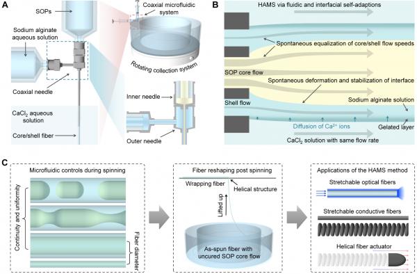针对上述问题,西安交通大学生命科学与技术学院仿生工程与生物力学研究所与海南大学生物医学工程学院赵国旭副教授(BEBC博士毕业生)和王东教授合作,通过材料学、生物医学、流体力学、机械制造等多学科交叉合作,开发了一种水凝胶辅助的同轴微流控纺丝方法,能够量产纤维形态优异的可拉伸纤维,普适于一大类不可纺聚合物。研究揭示了纤维制备过程的流体力学机制,并验证了不同组分和结构的可拉伸功能纤维的应用潜力。