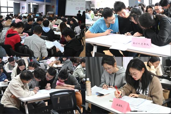 “必答题”环节,24支队伍按标签坐在相应区域,共同竞答一份纸质试卷。面对试卷上的题目,各团队同学或是专注认真,有条不紊,充分调动前期储备的知识安静竞答;或是小声交流,合作探讨,集智交出最终答卷。经过排名,16支队伍成功晋级第二环节。
