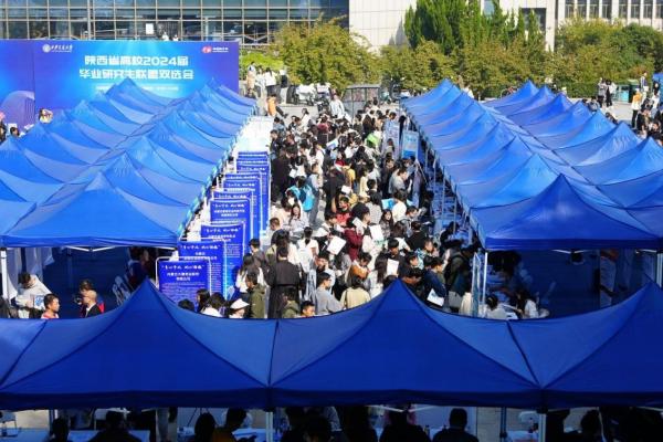 10月22日,陕西省高校2024届毕业研究生联盟双选会活动在西安交通大学兴庆校区四大发明广场举办。来自全国的332家用人单位进校揽才,包括中国航天科工集团、中国电子科技集团、中国船舶集团、中建集团、中国化工集团、中国科学院、中石化、中石油、国家能源集团、空军军医大学、武警部队研究院、特变电工、云天化等重点单位,以及重庆市、吉林省、德州市、呼和浩特市等地方组团,提供岗位超过6000个。