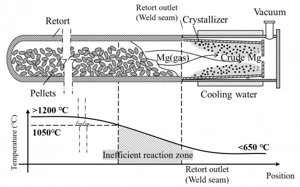 图文解析:如图1所示,真空硅热法炼镁的基本工艺流程为:将煅烧后的白云石、硅铁和萤石三种原材料按配比混合、磨粉、压制成料球,以堆积的方式填充进还原罐,在10 Pa左右的真空、1200 ℃以上的高温条件下,将金属镁还原出来并形成高温镁蒸气。随后镁蒸气在压强差的驱动下,从还原罐流动到结晶器内(温度在500 °C以下),并直接从气态冷凝为结晶粗镁。受水冷结晶器的散热影响,在还原罐罐口附近存在梯度降温区。梯度降温区内的料球并不能在设置的还原时间内完全反应;且温度越低,对应料球的还原率也就越低。该工作将单个料球还原率不足50%(对应温度不超过1050 ℃)的区域称之为不充分反应区。