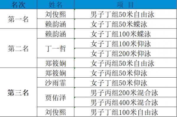 西安交大派出6名运动员参加了12个单项的比赛。队员们凭借顽强的意志,不断突破自我,最终斩获2金4银5铜,女子丁组团体总分第六名以及男子丁组团体总分第八名的优异成绩。其中,刘俊熙获男子丁组50米自由泳第一名,赖韵涵获女子丁组 50米蝶泳第一名。