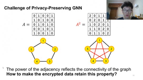 徐望瀚总结科研成果,以第一作者在国际会议上发表一篇论文,创新性提出通过矩阵的特征值分解实现图数据加密的方法。今年7月,他在该会议上发表时长30分钟的主题报告,介绍该论文中的核心技术。另外,他还和同学合作研究其他课题,并有多篇论文在投或待投稿。