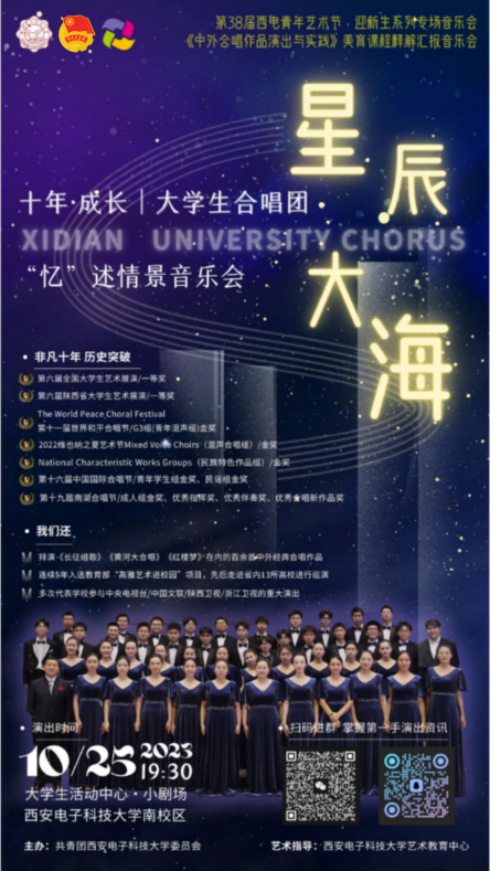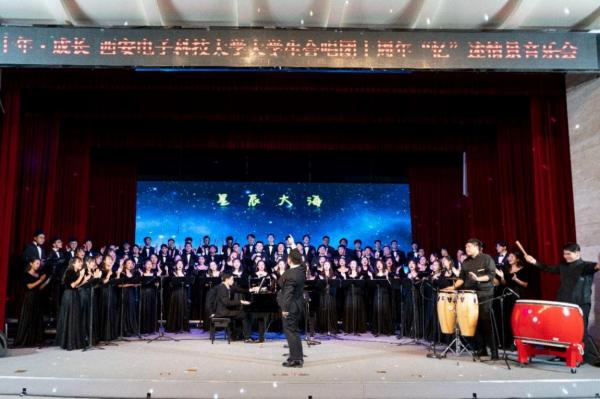 十年成长,信守初心。10月25日晚,由校团委主办、校艺术教育中心艺术指导的第38届“西电青年艺术节”迎新生系列专场——“星辰大海”西电大学生合唱团纪念建团十周年“忆”述情景音乐会在南校区大学生活动中心小剧场举行。著名男中音歌唱家、陕西省合唱协会秘书长兼副会长李锐,陕西省合唱协会副会长、人文学院教授周伟,人文学院艺术系主任王成来等作为专家代表参加音乐会,人文学院、校团委等相关负责同志与各学院、书院团委书记、辅导员等近600人观看了此次音乐会。音乐会指挥由大学生合唱团/交响乐团指导教师华俊文担任。此次音乐会还是《中外合唱作品演出与实践》美育实践课程释解汇报音乐会。
