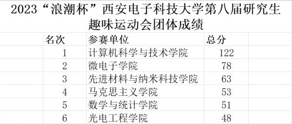 最终,计算机学院以总分122的成绩拔得头筹,成为团体第一名,微电子学院、材料学院、马克思主义学院、数统学院、光电工程学院分获团体第二至第六名。计算机科学与技术学院和马克思主义学院获优秀组织奖,空间科学与技术学院和物理学院获体育道德风尚奖。