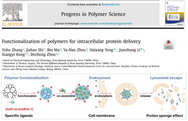 随着临床治疗需求的不断增长,传统小分子药物因其半衰期短、纯度低、溶解性差、副作用严重、起效慢和靶向性差等问题导致其临床应用受到很大限制。然而,蛋白质等生物大分子药物因其高特异性、高生物相容性以及避免基因重组等优点,已成为治疗传染性疾病、肿瘤、矽肺等疾病的研究热点,并取得了很多满意的临床效果。近日,西安交通大学第二附属医院胸外科李建忠作为共同通讯作者与西安交通大学化学工程与技术学院周德重教授共同在《高分子科学进展》(Progress in Polymer Science)在线发表综述文章《细胞内蛋白质递送功能》(Functionalization of polymers for intracellular protein delivery),详细汇总分析了目前蛋白质药物递送的现状、临床应用的巨大潜力以及局限性,为蛋白质药物递送的研究提供了新思路。