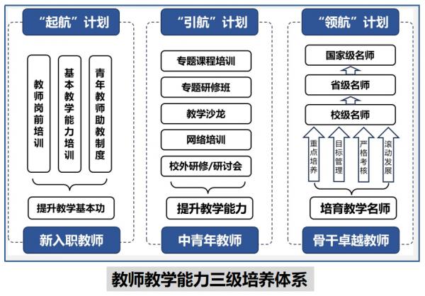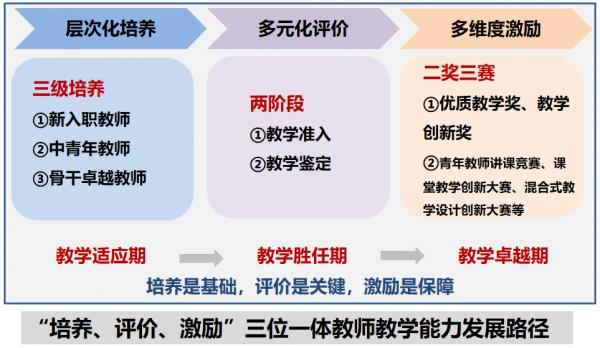 在支持教师成长成才和教学本领提升方面,强化思想政治引领,严把德育能力关;夯实基本技能培训,通过教学准入、教学评价严把教学准入关;挖掘过程性评价数据,通过多元评价,严把课堂质量关;建立预警及退出机制,综合教学鉴定、教学评价,严把教学改进关。
