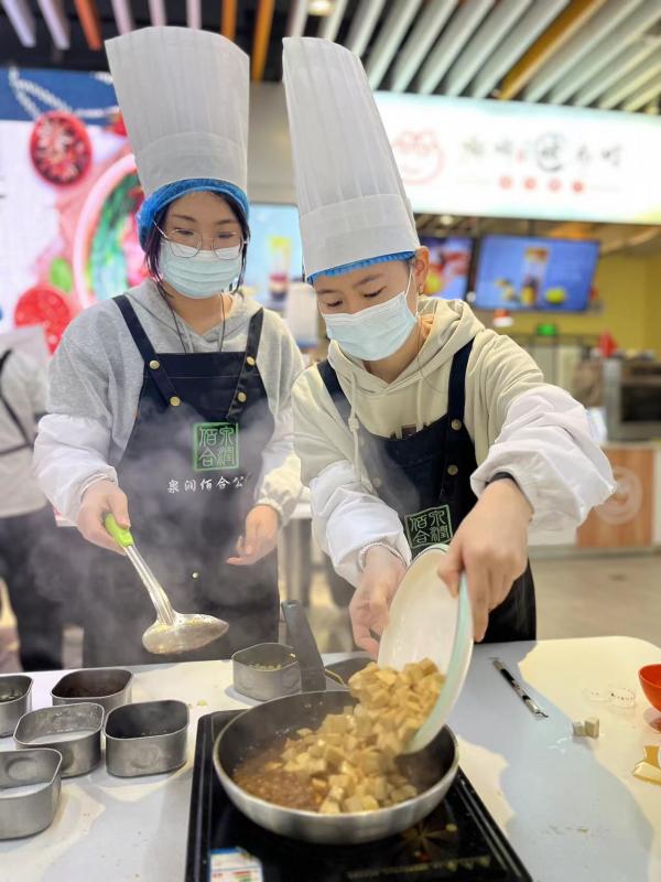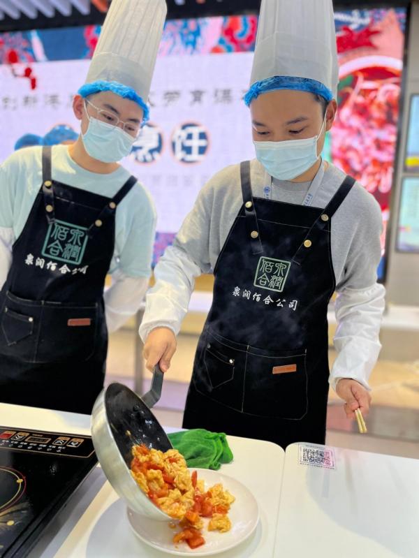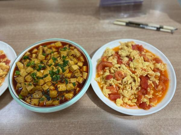 之后是烹饪环节,同学们认真倾听学习炒菜使用的调料、主辅料搭配、烹饪技巧,并跟着授课老师的示范,进入动手实践环节。一阵悉心烹饪后,课堂现场便散发出诱人的香味,西红柿炒鸡蛋、麻婆豆腐两道色泽鲜美、香气浓郁的家常菜在同学们两两协力合作下美味出锅。