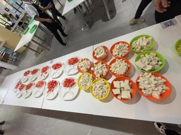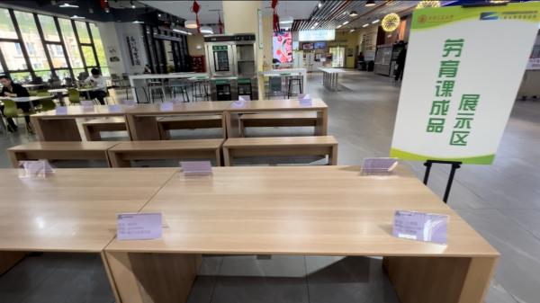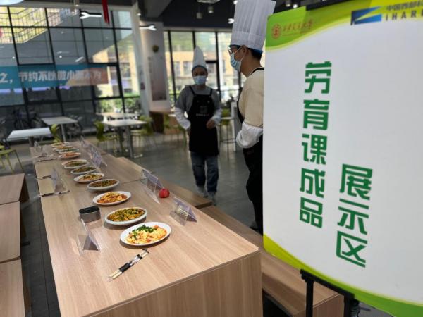 后厨参观结束后,同学们齐聚朗清苑一层大厅,开始了本次劳育课。操作现场按照后厨加工流程设置了蔬菜切配区、肉类切配区、烹饪区以及成果展示区,让同学们亲身体验食堂荤素分类、生熟分区等基本管理要求,以便对食堂食品安全有更深入的认识。