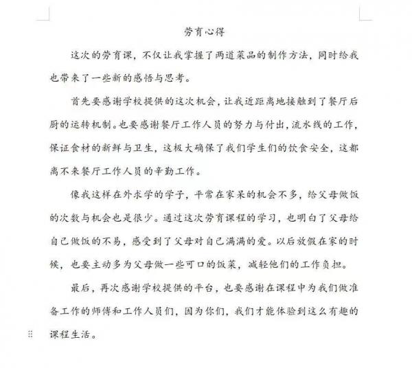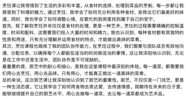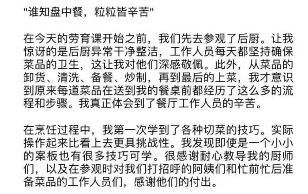 伴着饭菜的香气,同学们互相品尝了自己烹饪的菜品,纷纷发表了心得感悟:“这次课程让我的厨艺有了进步,也体会到了食堂工作的不易,明白要珍惜粮食,尊重他人劳动成果”“品尝自己的劳动成果,吃出了满满的幸福感,迫不及待要回家给妈妈尝尝”“今天学会的两道菜,我打算回家给妈妈做,在未来的旅途中再次做今天学到的两道菜时,一定会激起许多美好回忆”“通过这次劳育课程的学习,明白了父母不易,感受到了父母满满的爱,以后在家时要主动为父母做可口饭菜,减轻他们的工作负担”。