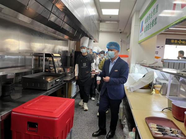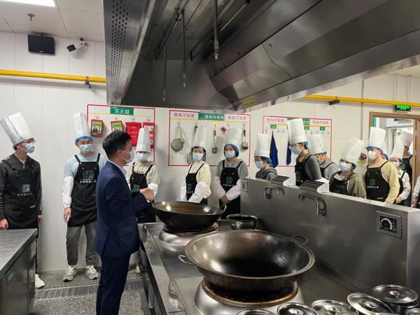 在课程开始前,同学们认真学习厨房员工仪容仪表规范,在做好头发、手部等防护消毒措施后,食堂管理人员带领同学们先后参观了食堂库房、粗加工间、主食加工间、烹饪间以及餐具洗消间等功能间,实地查看了食堂环境卫生、食品留样、餐具消毒、食物储存加工等,让同学们近距离了解食堂管理规范和后厨流程,并观摩工作人员切配、烹饪、食品加工等环节,进一步了解食堂的日常管理情况。