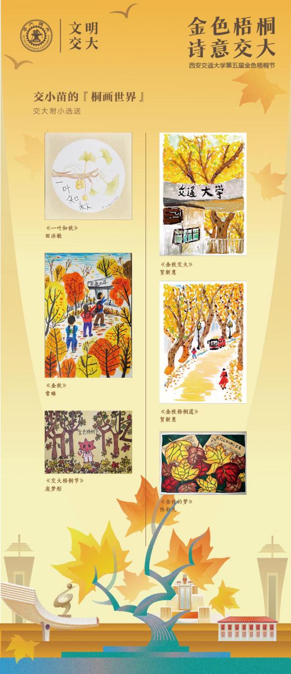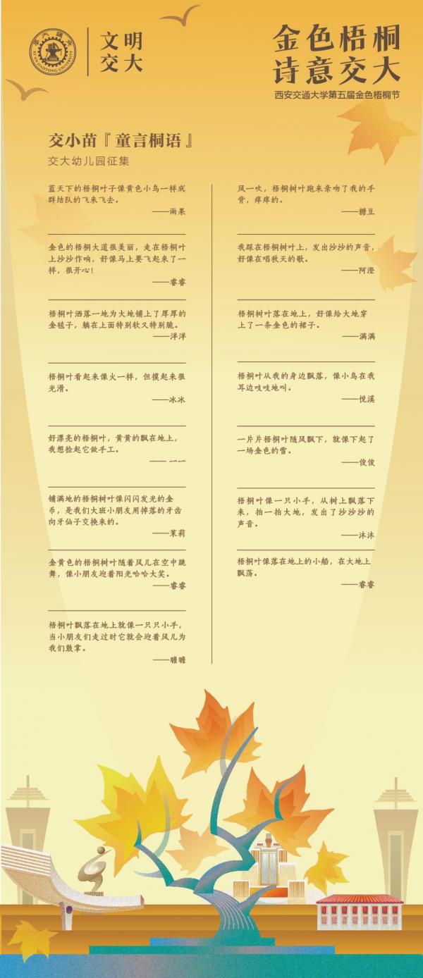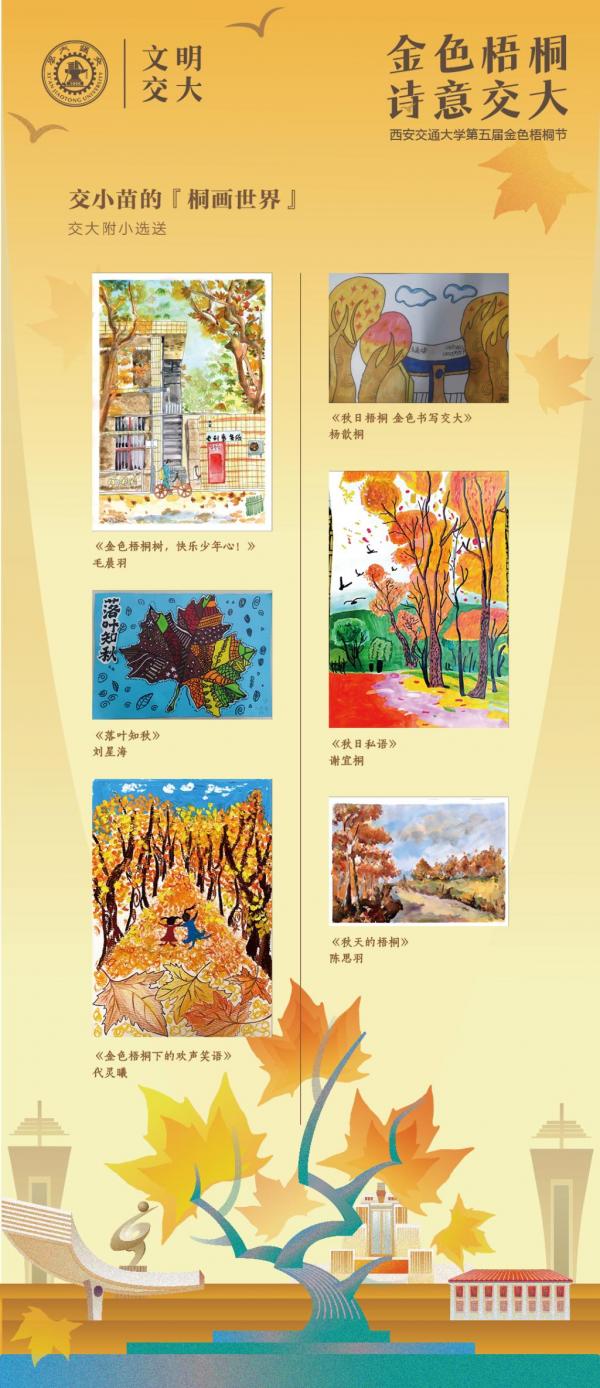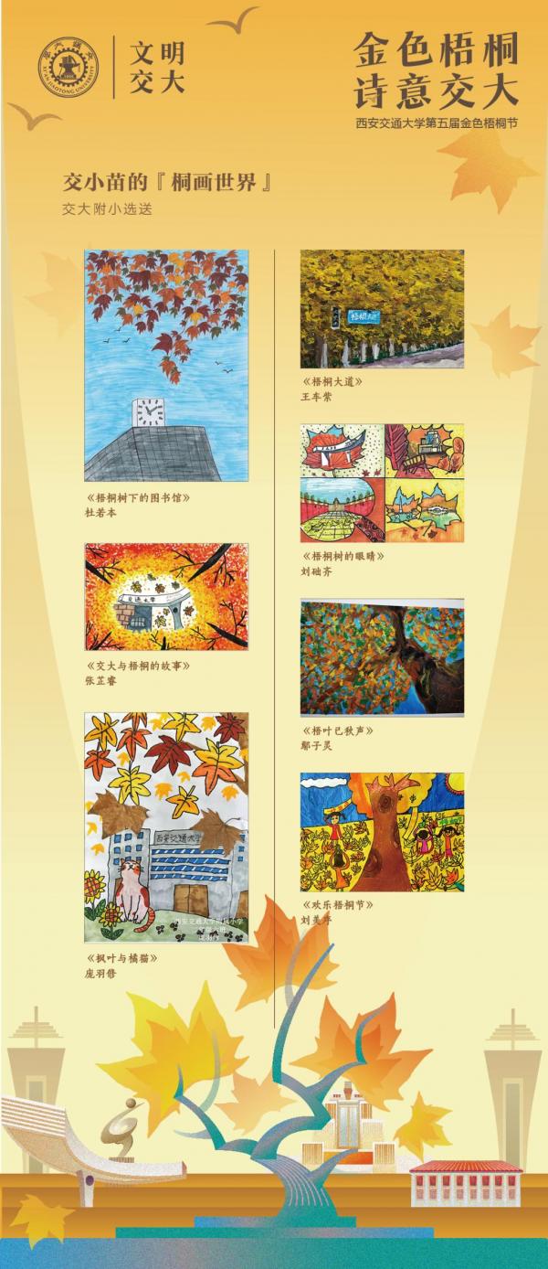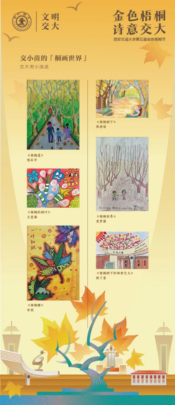 “梧桐叶飘落,像手掌轻轻抚摸我的脸庞。”“梧桐叶像落在地上的小船,在大地上飘荡。”本届梧桐节前,校工会、交大附小、交大幼儿园、“交小苗”公众号联合发布 “金色梧桐”主题童言童语和绘画作品征集,得到了“交小苗”的积极参与,有123条“桐诗”、61幅“桐画”入选金色梧桐节“交小苗”专题展览。