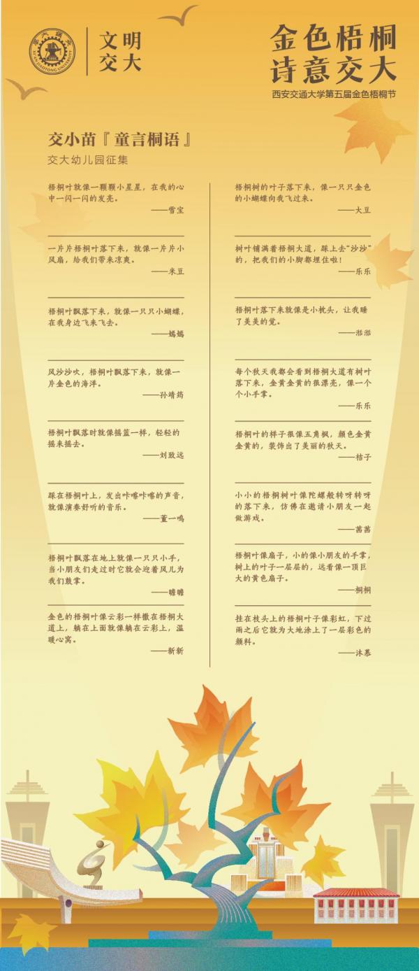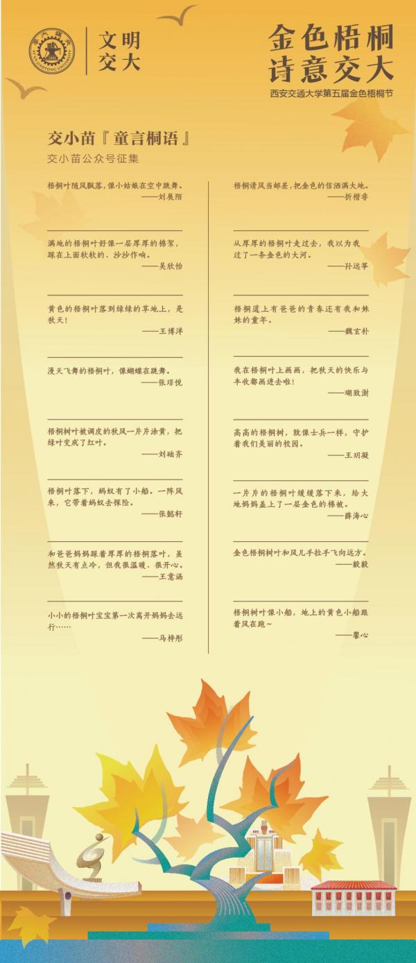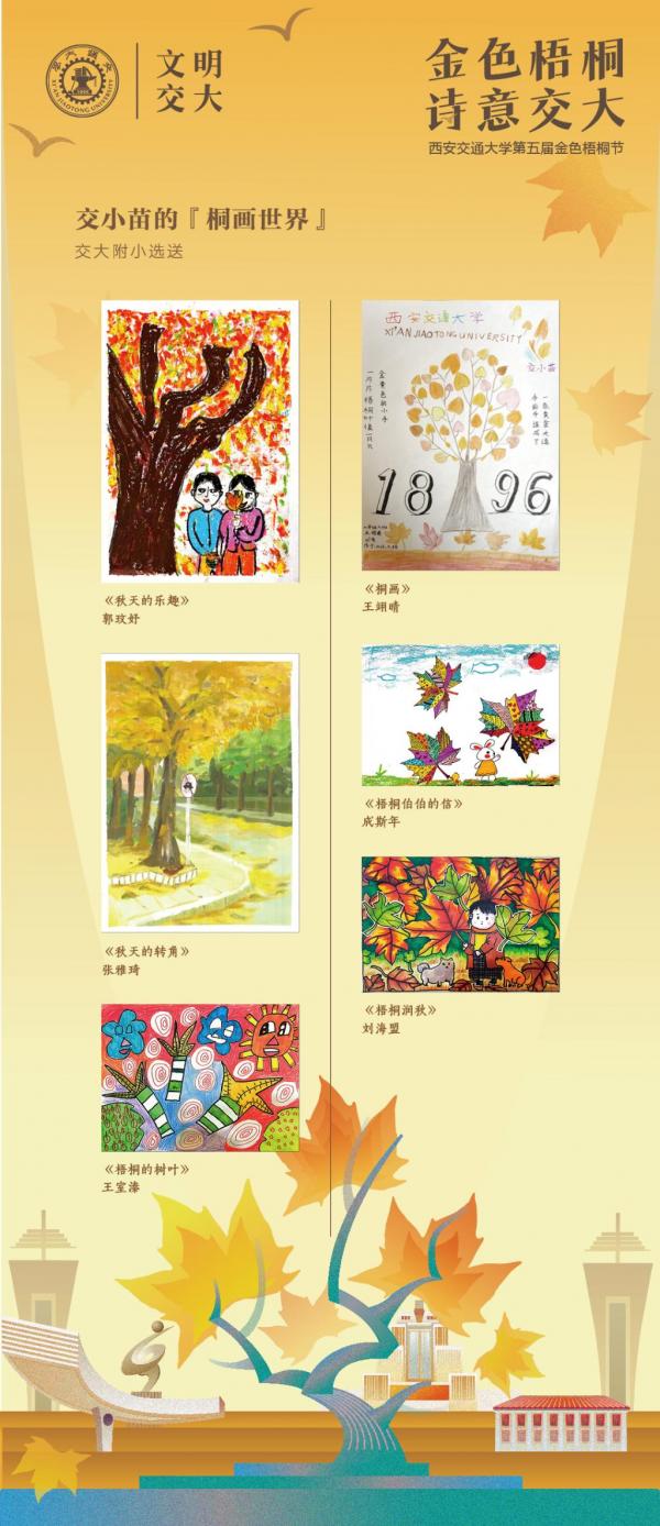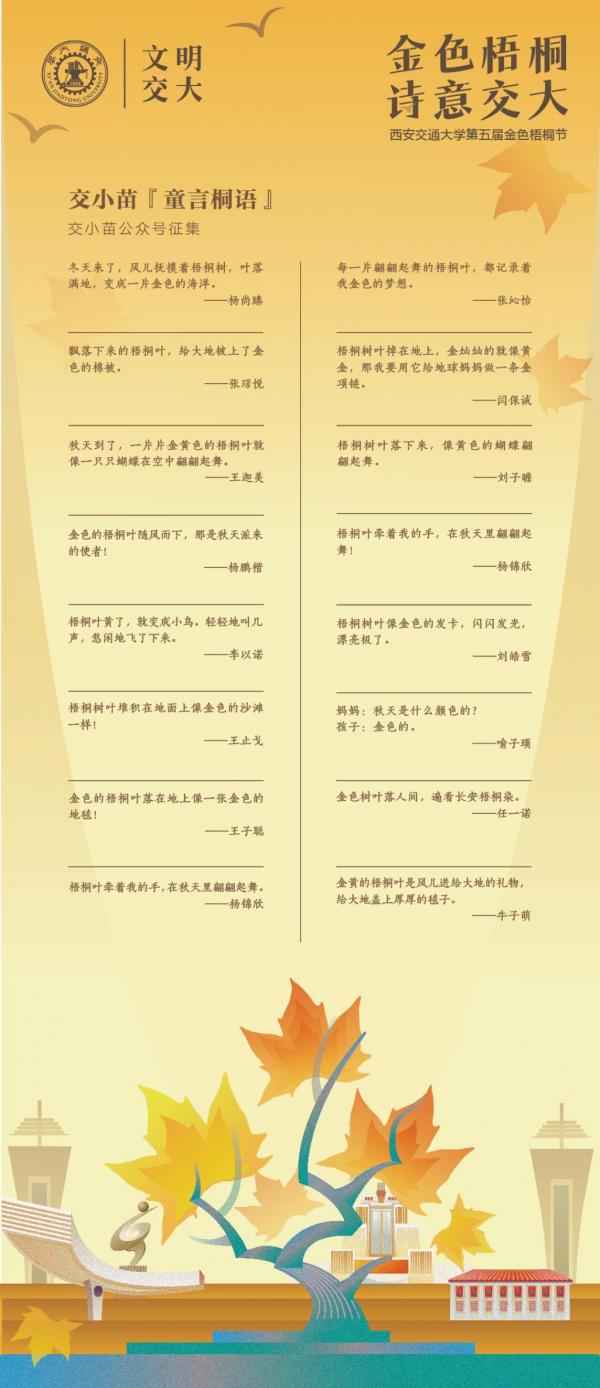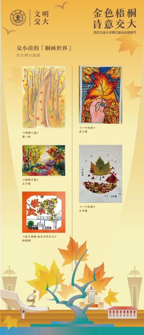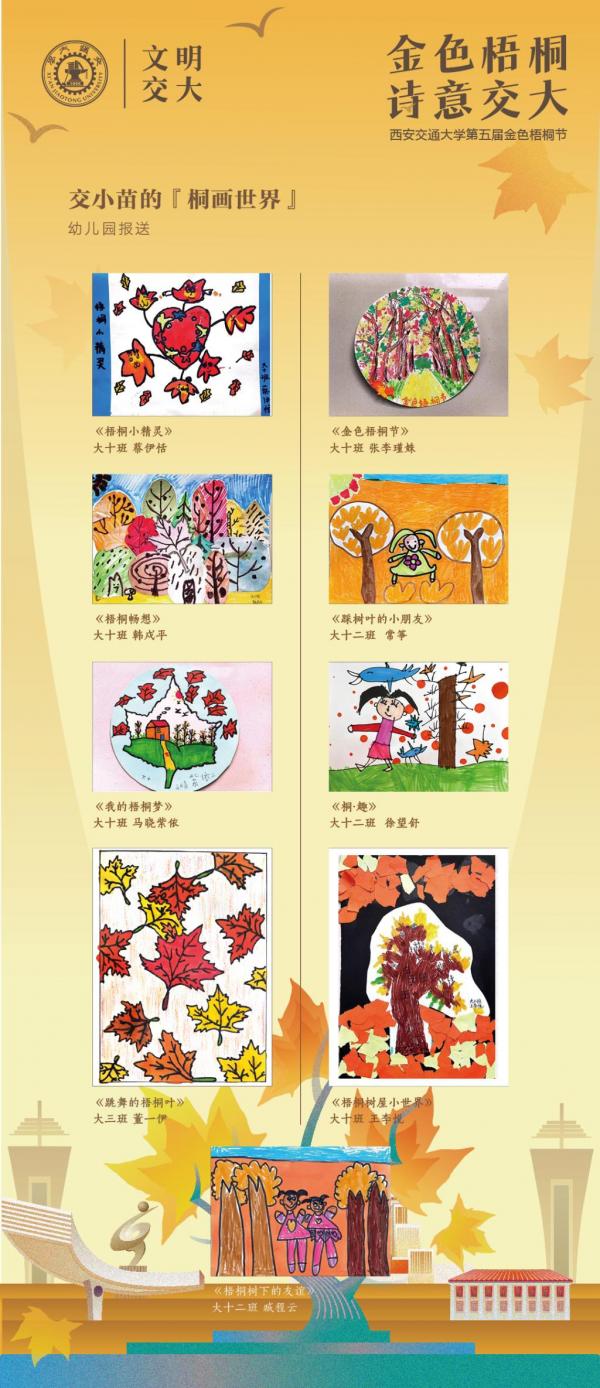 “梧桐叶飘落,像手掌轻轻抚摸我的脸庞。”“梧桐叶像落在地上的小船,在大地上飘荡。”本届梧桐节前,校工会、交大附小、交大幼儿园、“交小苗”公众号联合发布 “金色梧桐”主题童言童语和绘画作品征集,得到了“交小苗”的积极参与,有123条“桐诗”、61幅“桐画”入选金色梧桐节“交小苗”专题展览。