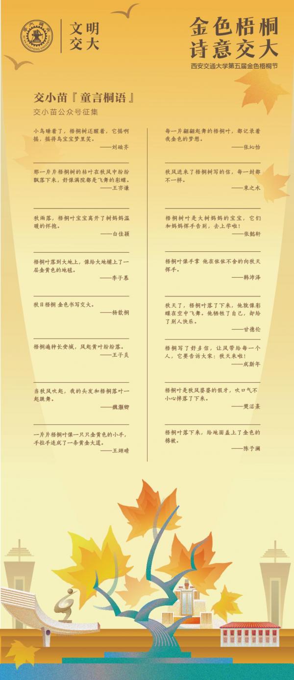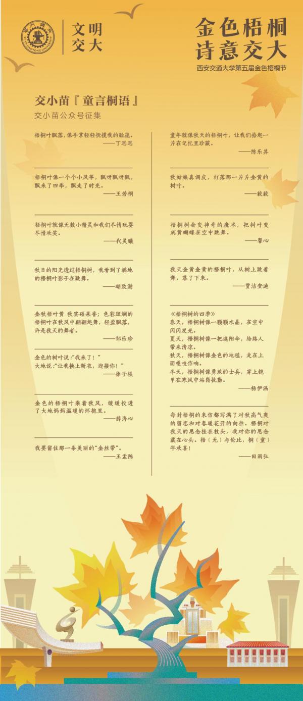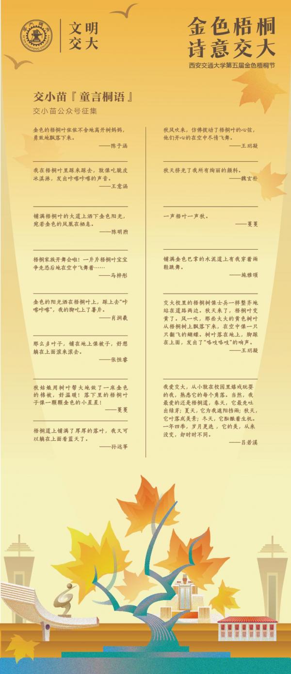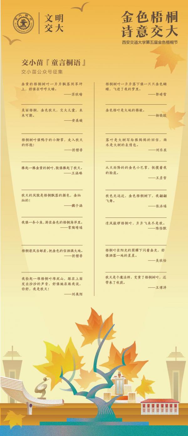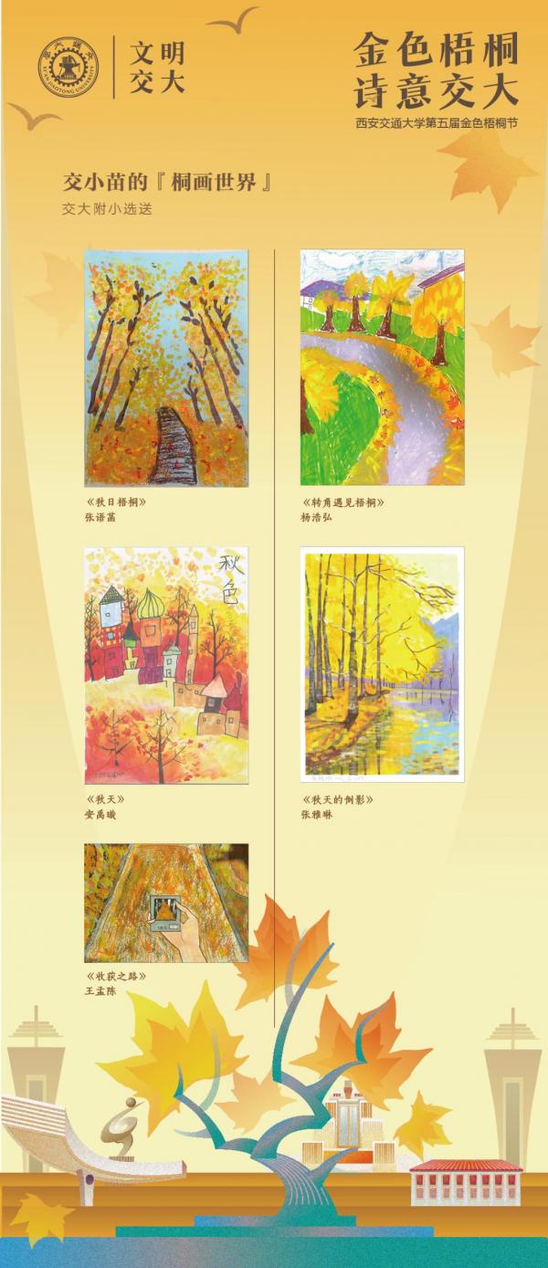“梧桐叶飘落,像手掌轻轻抚摸我的脸庞。”“梧桐叶像落在地上的小船,在大地上飘荡。”本届梧桐节前,校工会、交大附小、交大幼儿园、“交小苗”公众号联合发布 “金色梧桐”主题童言童语和绘画作品征集,得到了“交小苗”的积极参与,有123条“桐诗”、61幅“桐画”入选金色梧桐节“交小苗”专题展览。