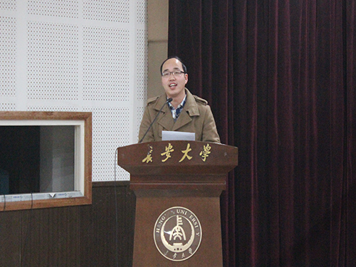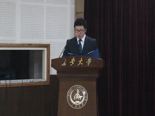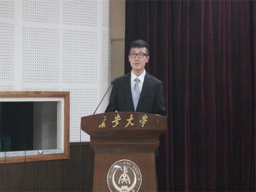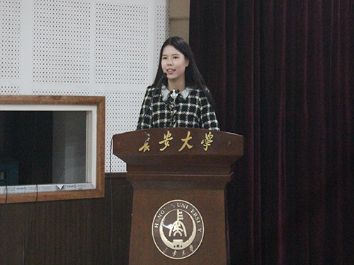 长安大学学生会副主席蒋萌萌做了校院两级学生会交流工作。她首先向我院取得的优秀成果表示祝贺,并将校学生会举办的活动及从中取得的宝贵经验和大家分享。