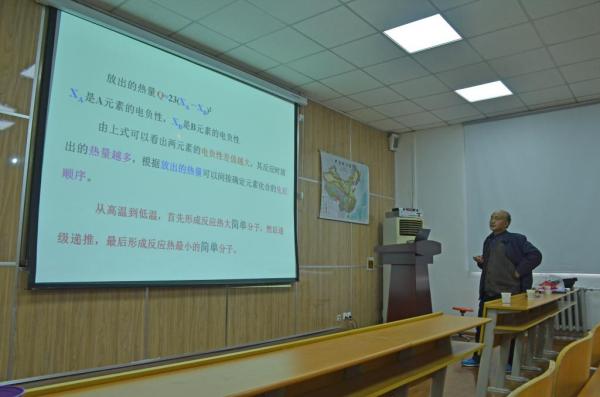 报告主要分为四个方面。首先介绍了地球形成过程中元素的化合规律以及矿产成因的相关性,李老师主要从物质状态与温度、高温气态原子的降温过程等方面对此进行了论述;接着,李老师介绍了内生成矿热液中硅酸对元素的迁移作用,尤其是对成矿物质的沉淀的原理、条件进行了详细的阐述;随后主要介绍了内生成矿中元素共生组合的物理因素,对多种金属、非金属元素,气体、非气体元素等的共生特点进行了分析;最后,李老师以西秦岭金、锑矿的垂直分带规律,河南省灵宝大湖金、钼矿等为例详细剖析了元素的物理性质。