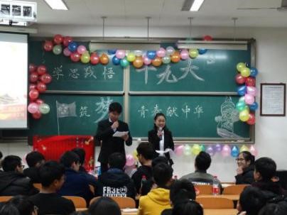 为了学习和贯彻十九大精神,高举中国特色社会主义伟大旗帜,我院土地整治工程三班于2017年12月2日晚七点在明远1316教室举办“学思践悟十九大,筑梦青春献中华”为主题的团日活动。本次活动邀请到资源学院团委组织部部长雷满红、副部长段向宇、院学生会体育部部长钟晨语、文艺部部长覃泽华、秘书处副秘书长杨建政、学术部部长张阶帆、新网部部长张天浩、生活部部长张响、科协竞赛部部长张超、大志团支农支教部部长赵铭凯、葛玉洲等同学出席。此次活动杨舒媛及田兆宁同学主持。