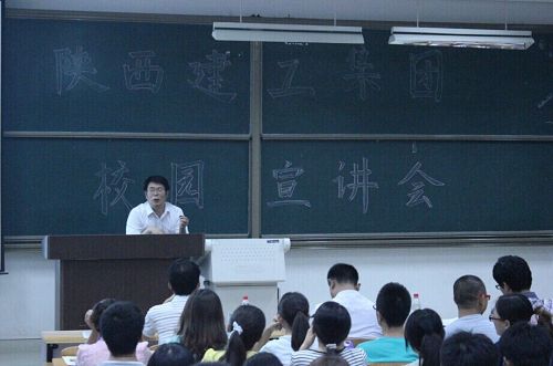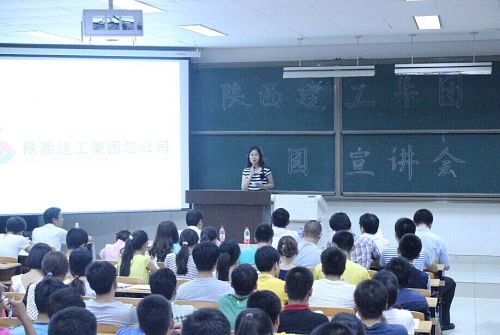 接下来,陕建集团人力资源部招聘主管佀伟向我们介绍了陕西建工集团的整体情况,并用陕建集团宣传短片加以辅助讲解。佀伟先生首先表明此次宣讲会的目的是希望同学们对陕西建工集团有进一步的了解,从而对自己今后的实习就业有所帮助。佀经理条理清晰的从公司概况、行业优势、人才队伍和科技成果等四方面向我们展示了陕西建工集团的就业优势。他不仅阐述了陕西地区的就业生活优势,还向大家详细的讲解了陕西建工集团的招聘方向、薪酬制度、培训体系和职业发展前景等学生们所关心的话题。