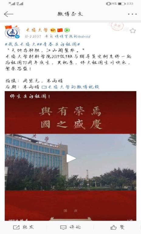 9月30日中午12点30分,辅导员史柯老师和九班同学在长安大学逸夫图书馆共同合唱《我和我的祖国》,之后一同为祖国母亲庆生。