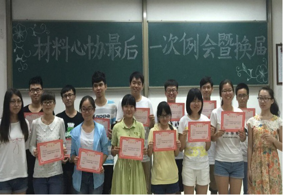 2016年6月19日晚7点,材料心协于明远1105教室举办了2015–2016学年心协最后一次例会暨换届大会,材料心协全体成员出席本次会议。