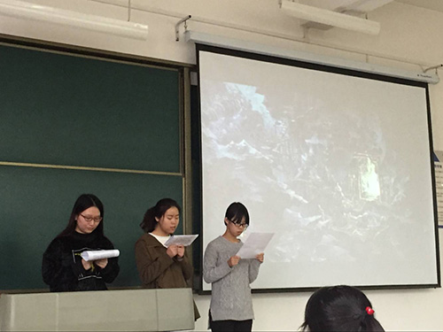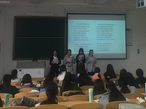 此次中文班团日活动举行了名为“诵爱国诗,传中华情”的诗歌朗诵比赛。班内同学共分为10组,分别准备PPT和背景音乐,朗诵了《祖国,我爱你》《我的祖国》《我们时刻准备着》等经典篇目,朗诵比赛之后,每个组的同学代表就中国梦进行了发言,期间有同学表示,爱国精神应该贯彻在生活中的一点一滴之中,而不是仅仅通过这一次诗歌朗诵表达。活动最后主持人作结,活动共持续一个小时。