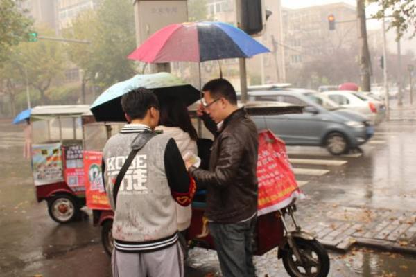 早上七点半,天还没有完全亮,温度只有六七度,学校北门口已经集齐了成员。在点名分组过程中,下起了雨,即使很多人都没有带伞,但没有一个人想要退缩,而是冒雨前行。经过了公交地铁公交的的长途奔波,大家于九点半到达。各组长带领组员,手拿宣传单,抱着募捐箱开始劝募。一开始,很多路人连连摆手,拒绝听大家的宣传。还有人说,怎么到处都是找人要钱的,冷眼相对。来之前大家已经做好了充足的心理准备,不但没有轻易放弃,而是越挫越勇。用更加耐心,真诚的态度进行宣传活动。社会上还是好人多,通过大家的努力,情况好转,不论捐的钱多与少,都是一份爱心。每成功劝募到,大家都眼神示意,继续加油!过程中还有很多令人颇为感动的事,偶遇一位长安大学家属,捐了重金却不留名,只单纯为表达爱心和对大家的支持。还有善良的路人主动向我们了解活动,积极参与募捐,留下了联系方式。忙碌中,大家丝毫不在乎雨水打湿了头发,衣服,顾不得打伞,裸露在外的双手已经冻得紫红,这时有好心人捐款完不忘给大家捐伞,这一刻,大家心里充满了温暖和感动。大家将多余的伞也送给路过的淋雨的路人,将这简单的温暖传递下去。