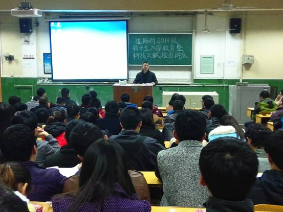 11月26日晚7:00,道路所在长安大学雁塔阶三教室举办了2014级道路与铁道工程专业研究生入学教育暨科技文献检索讲座。道路所2014级全体研究生参加了讲座会,会议由道路所所长马骉教授主持,副所长郑木莲教授和汪海年教授及研究生班导师蒋玮副教授、纪小平副教授、秦雯博士出席了此次讲座。