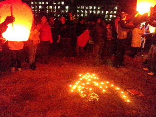 11月1日晚上8:00,全班同学相聚于西区篮球场,举行了点燃孔明灯,放飞梦想的活动。两人一组在孔明灯上写下了自己的梦想。写好后大家围成了一个圆,在圆的中间有用蜡烛摆成的“梦”,准备好之后,点燃了“圆梦”,放飞梦想。寄托着大家的梦想的孔明灯在天幕的映衬下愈发显眼,为活动画下了圆满的句号。