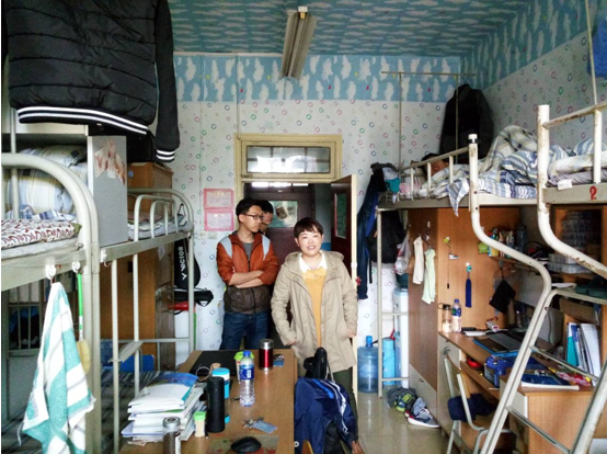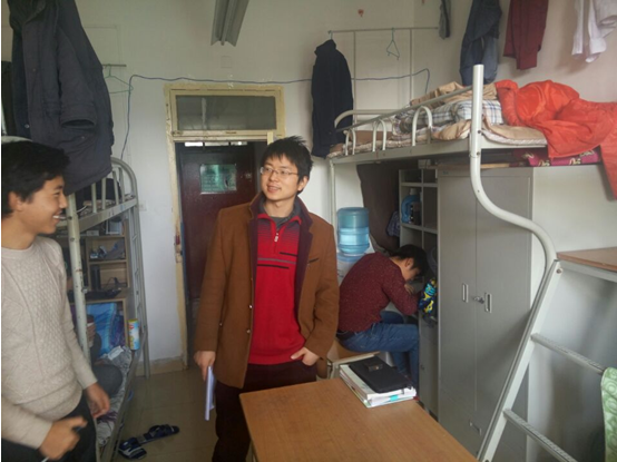 寝室卫生大都整洁干净,同学们对自己的床褥都收拾得很整齐,老师们称赞了几个宿舍卫生极好的宿舍并鼓励她们继续保持。但仍有个别宿舍卫生不够整洁,有些杯子、电脑等小物品摆放不整齐,老师告诫她们要注意宿舍卫生。检查的过程中,老师们与寝室人员轻松交流,告诫他们注意个人卫生,询问他们的课程,让他们注意休息;在寝室应当多学习,多看书,好好利用时间,抓紧每一分钟。他们还亲切地询问了每一个学生在生活中遇到的困难,老师同学们欢乐的交谈着,在不知不觉中拉近了老师与同学们之间的距离。