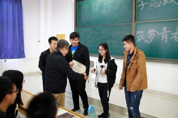 图书阅读结束,由班主任为本次团日活动策划提案的同学颁奖,同学们热烈鼓掌。最后,参加活动的全体人员在“践行社会主义价值观”巨形铁字前合影留念,活动正式结束。