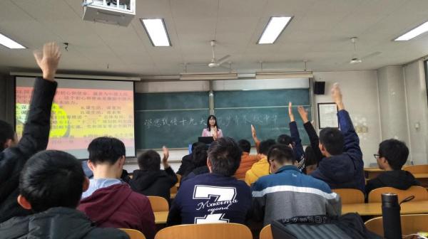 11月28日上午十点,班委们提前到达场地,并完成教室布置工作。同学们到齐后,十九大知识竞赛问答活动正式开始,本次活动以PPT的形式展开,同学们自由举手竞答,说出答案并解释原因,一道题1分,给予得分最高分者高端金属书签奖励。班委组织全班同学顺利开展了活动,活动氛围轻松愉快。