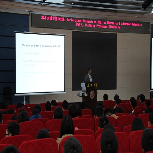 4月8日晚,“渭水大讲堂”第一四二讲在渭水校区会议中心报告厅举办,西澳大利亚大学胡晓智教授作了题为“World-class Research on Applied Mechanics & Advanced Materials”的讲座。工程机械学院院长吕彭民、工程机械学院党委副书记曾力、工程机械学院学办主任程宝虔、工程机械学院团委书记谢静、各年级辅导员及部分老师出席了本次讲座。演讲由渭水校区办邱旭辉主任主持,工程机械学院部分老师及500余名学生聆听了报告会。