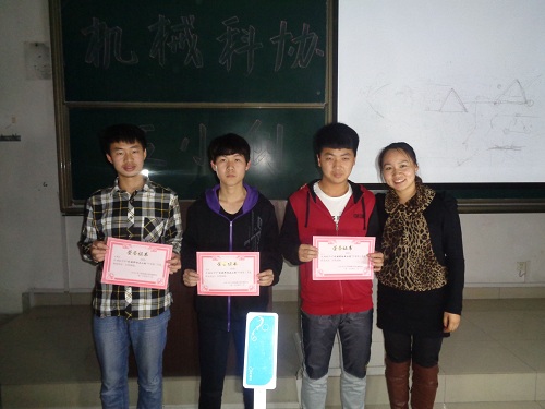 在这紧张而又激动的气氛中,比赛不知不觉接近尾声。在公布结果之前,由谢静老师对此次比赛做点评,她对同学们的努力做出肯定,并提出宝贵的建议。同时,谢老师希望同学们能够踊跃参加此类比赛,为以后的“挑战杯”与“全国大学生机械创新设计大赛”积累宝贵的经验。最后,主持人宣布获奖作品,接着颁发奖状,获奖参赛小组与颁奖嘉宾合影留念。最终本次大赛在大家热烈的掌声中圆满结束。