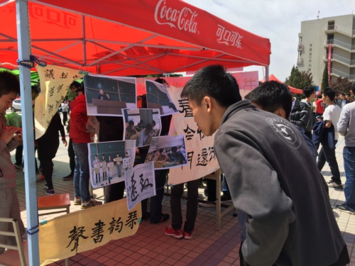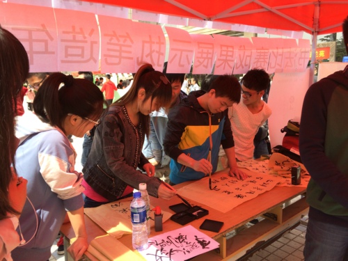 在随后的第二天,我们团日活动第二步也准备就绪,在中午十一点的团委大联合中,我们三个班的班委身先士卒,用早就准备好的材料将宣传地点布置的很有书生意气的感觉,加上自制的海报,很快就吸引了很多人的注意。我们提供准备好的笔墨纸砚来让大家尝试写毛笔字,更有学习了多年书法的周思成同学在一旁指导,桌子前很快就挤满了有意尝试的同学。这样一中午下来,有很多的人都能更好地了解书法,虽然同学们都忙得很累,心里却很高兴。