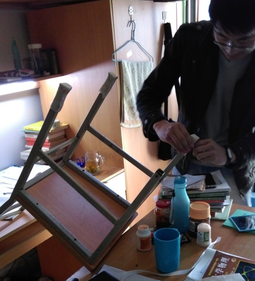 18:00,在团委英明神武的领导下,先从各自宿舍做起,同学们踊跃参加 分工(剪布料,缠脚凳,粘胶布)明确,快速完成了相关工作,活动流程有条不絮,现场热闹非凡,同学们灿烂的笑脸都映在脸上。18:20,同学们走出宿舍奔赴其他宿舍开始了本次活动最有意义的一个环节:帮助邻近宿舍缠脚凳,二人一组,配合默契,在与其他宿舍同学的谈笑风生中高效完成任务。期间,他们对此活动充满疑问,好奇,各种问题接连不断,同时感激的话语也连绵不断,同学们笑在脸上,乐在心底。18:50,整理好材料,活动正式结束。