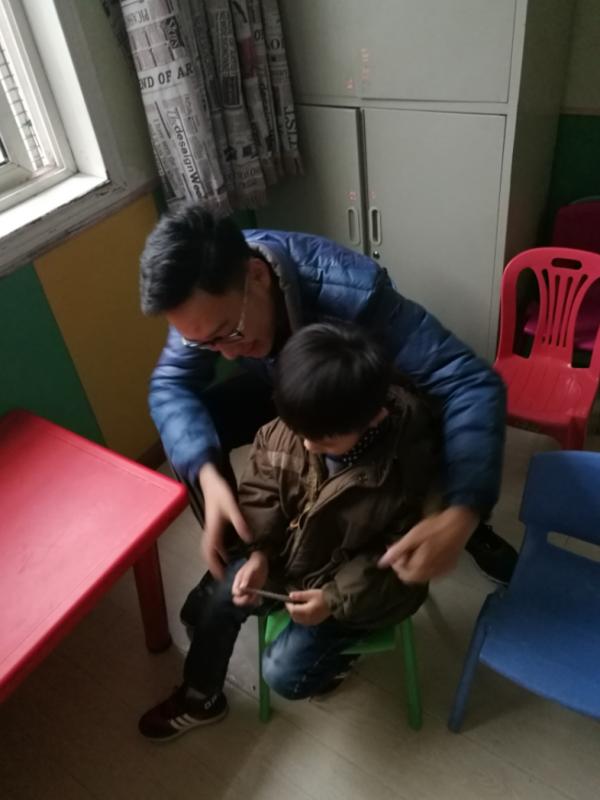 这一次志愿者们没有单独被分配到不同的教室,而是一起照顾小朋友们,孩子们见到志愿者哥哥姐姐竟会激动的手舞足蹈,这让志愿者们十分感动。随后,已经熟络的他们默契十足的完成课堂上的小活动。循环体能课上孩子们已经可以独自走上滑梯,再下来跳绳,然后走平衡木,跳圆圈。和之前只完成一项都很困难相比,这个学期孩子们有了很明显的进步。而这些进步与老师们的辛苦付出是分不开的,当然,志愿者们的用心助教也是原因之一。生活课上,原本不会说话的一个孩子出人意料的说了一声“薯片”,虽然发音不是很清楚,但每个老师都有着无以言表的兴奋,孩子们就是在这些一点点的进步中,慢慢走出只有自己一个人的世界,也给了老师们一直呵护着他们的动力。