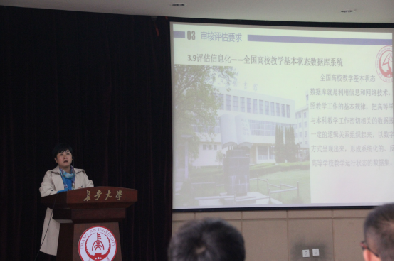 10月19日中午12:30,高年级会议准时开始。王斌娟老师首先介绍本次教学评估的各项事宜。她指出,教学评估并非一个人的事,而是需要每个同学的积极参与才能顺利完成。王老师针对2015级同学存在的问题,重点从生活方面进行要求:有序的用餐、宿舍卫生、仪容仪表、礼貌用语等。之后施翊飞老师开始对2014级学生进行宣讲。施老师认为,审核评估工作是根据参评学校自身设定的人才培养目标来评价学校人才培养目标与效果的实现情况。专家们将在近期来我校开展预评估工作。希望同学们积极了解校史等知识,面对专家提问不慌并认真作答。