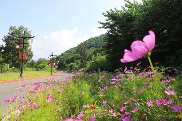 路边的格桑花、矢车菊、松果菊